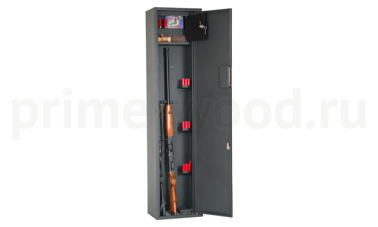 Шкаф оружейный ОШН-5Э на 2 ствола оснащен отделением под патроны. Ложементы — пластик. В дверь установлены 1 электронный замок и 1 ключевой 8-ми сувальдный замок.